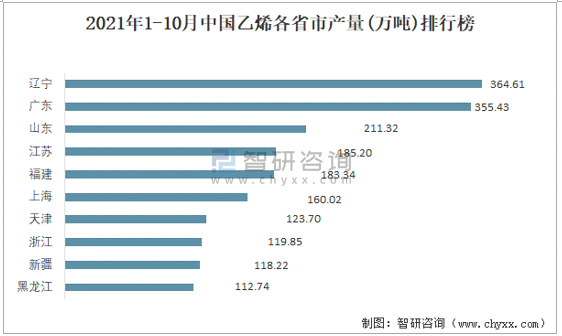 根据国家统计局数据显示:2021年各季度(第四季度暂只统计10月数据)中国乙烯主要集中在华东、东北、华南地区生产;2021年1-10月中国乙烯产量大区分布不均衡,其中华东地区产量最高,特别是山东省贡献了最多产量;2021年1-10月中国乙烯各省市产量中辽宁和广东两省产量领先于其他省份。