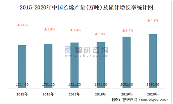 根据国家统计局数据显示:2021年10月中国乙烯产量为232万吨,同比增长4%;2021年1-10月中国乙烯累计产量为2320.1万吨,累计增长20.8%;2015-2020年中国乙烯产量逐年递增,2020年达到最大。