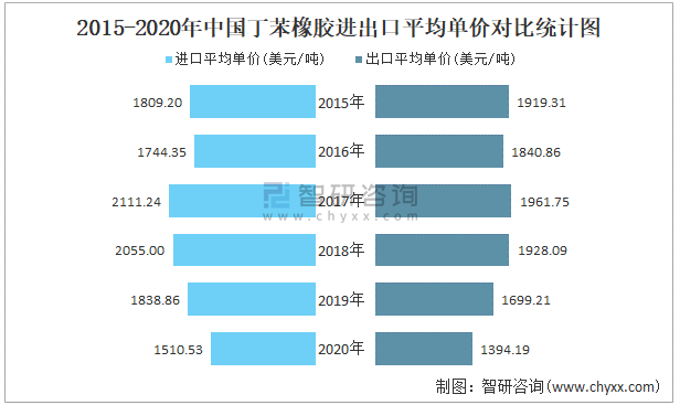 2015-2020年中国丁苯橡胶进出口平均单价对比统计图