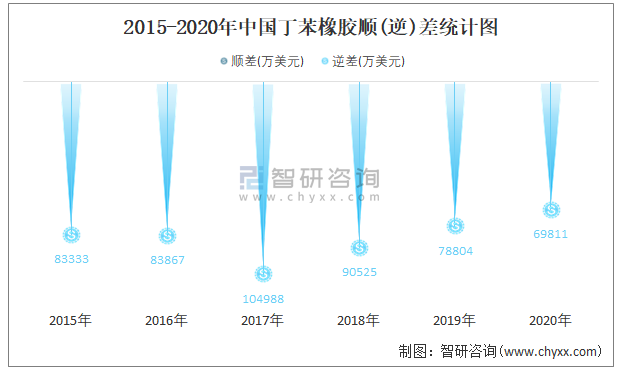 2015-2020年中国丁苯橡胶进出口金额对比统计图