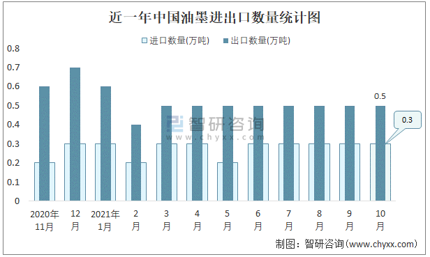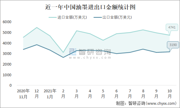 根据中国石油和化学工业联合会数据显示:2021年10月中国油墨进口数量为0.3万吨,出口数量为0.5万吨;进口金额为4741万美元,出口金额为3190万美元;近一年中国油墨出口总金额小于进口总金额,贸易逆差为主,进口均价15803美元/吨。