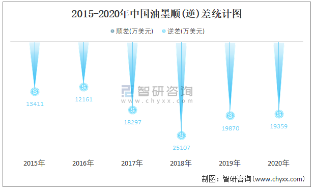 2015-2020年中国油墨顺(逆)差统计图