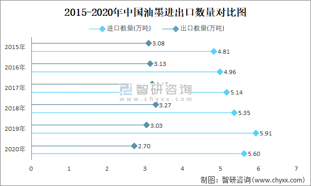 2015-2020年中国油墨进出口数量对比统计图