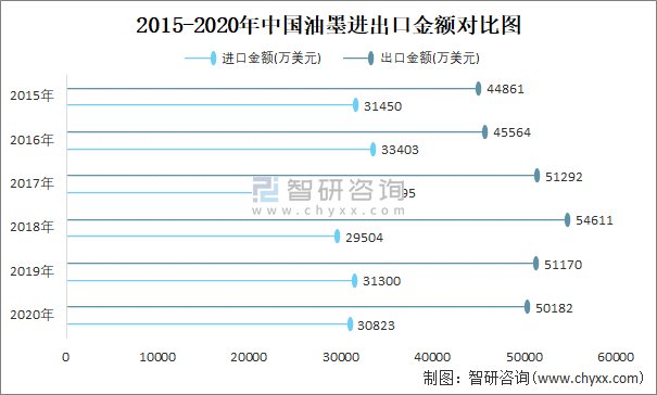 2015-2020年中国油墨进出口金额对比统计图