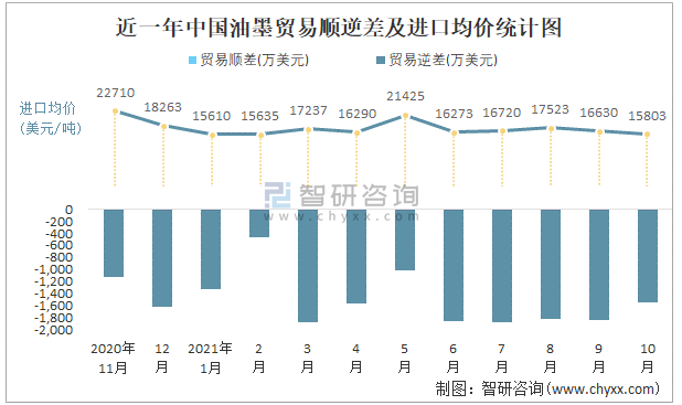 近一年中国油墨顺逆差及进口均价统计图