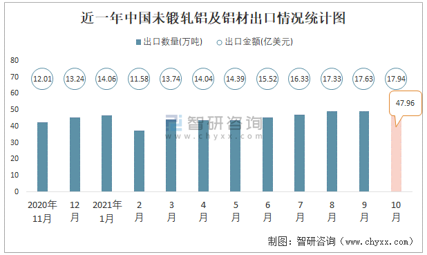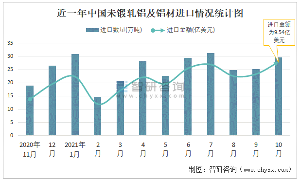 根据中国海关数据显示:2021年10月中国未锻轧铝及铝材进口数量为29.7万吨,同比增长15.8%,进口金额为9.54亿美元,同比增长63.1%,2021年10月中国未锻轧铝及铝材出口数量为47.96万吨,同比增长14.6%,出口金额为17.94亿美元,同比增长57.8%;2021年1-10月中国未锻轧铝及铝材进口数量为257.24万吨,进口金额为75.18亿美元,出口数量为454.7万吨,出口金额为152.52亿美元。