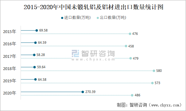 2015-2020年中国未锻轧铝及铝材进出口数量统计图