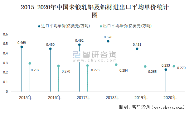2015-2020年中国未锻轧铝及铝材进出口平均单价统计图