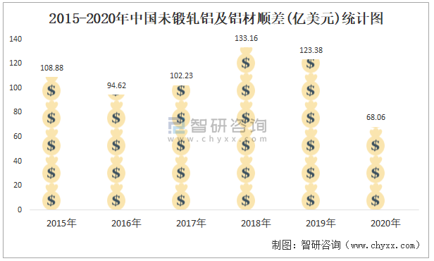 2015-2020年中国未锻轧铝及铝材顺差(亿美元)统计图