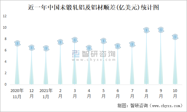 近一年中国未锻轧铝及铝材顺差(亿美元)统计图