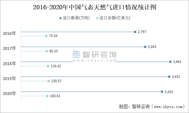 根据中国海关数据显示:2016-2020年中国气态天然气进口数量2018年达到最大值,此后逐年递减,进口金额2019年达到最高值,此后有所下降;2016-2020年中国气态天然气进口平均单价2018年增速最快,而2020年进口平均单价下滑速度最快,下滑了19.0%。
