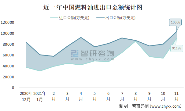 根据中国石油和化学工业联合会数据显示:2021年11月中国燃料油进口数量为169.5万吨,出口数量为179.6万吨;进口金额为91188万美元,出口金额为103667万美元;近一年中国燃料油出口总金额大于进口总金额,贸易顺差为主,出口均价577美元/吨。