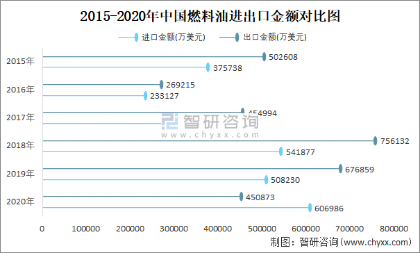 2015-2020年中国燃料油进出口金额对比统计图