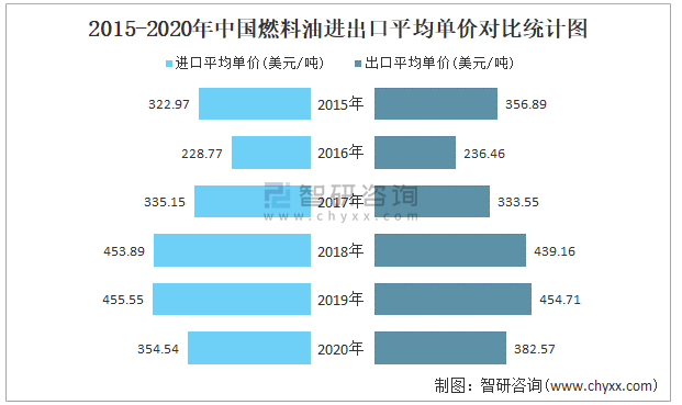 2015-2020年中国燃料油进出口平均单价对比统计图