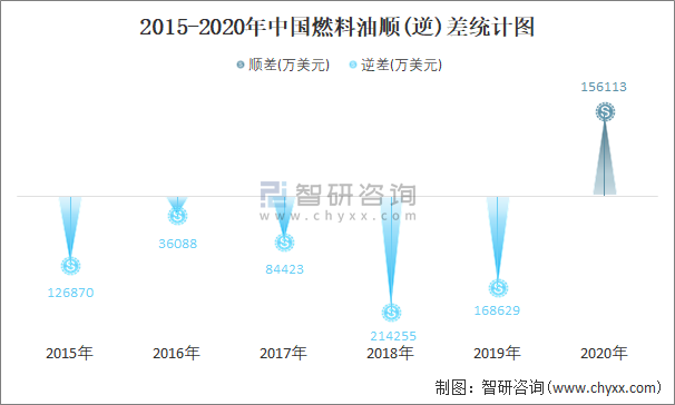 2015-2020年中国燃料油顺(逆)差统计图