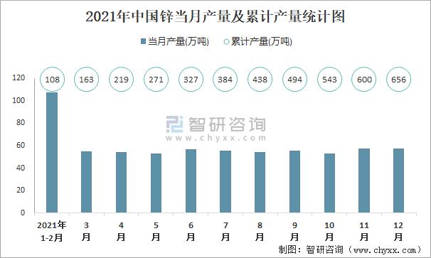 2021年中国锌当月产量及累计产量统计图