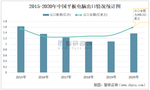 根据中国海关数据显示:2015-2020年中国平板电脑出口数量2018年跌至最低值,此后逐年递增,出口金额2017年跌至最低值,此后逐年递增;2015-2020年中国平板电脑出口平均单价2018年增长速度最快,而2020年中国平板电脑出口平均单价下降速度最快,下滑了2.5%。