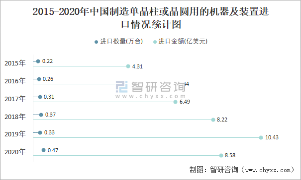2015-2020年中国制造单晶柱或晶圆用的机器及装置进口情况统计图