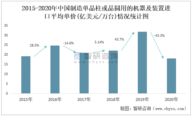 2015-2020年中国制造单晶柱或晶圆用的机器及装置进口平均单价(亿美元/万台)情况统计图