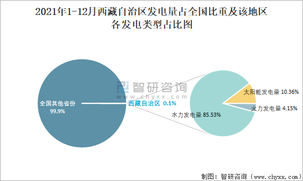 2021年1-12月西藏自治区发电量占全国比重及该地区各发电类型占比图