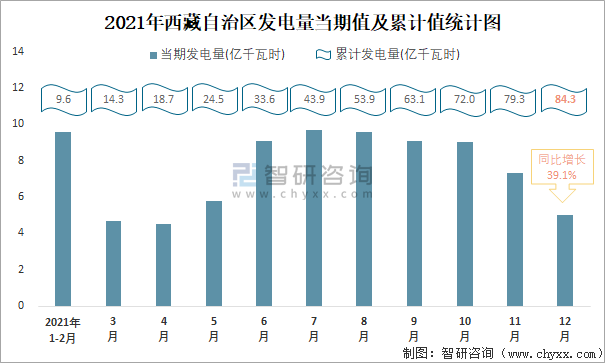 2021年西藏自治区发电量当期值及累计值统计图