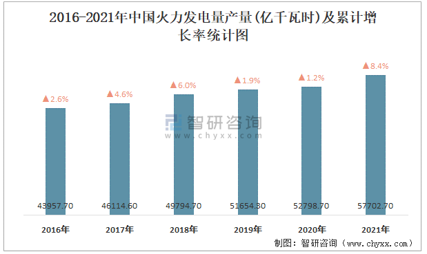 2016-2021年中国火力发电量产量及累计增长率统计图
