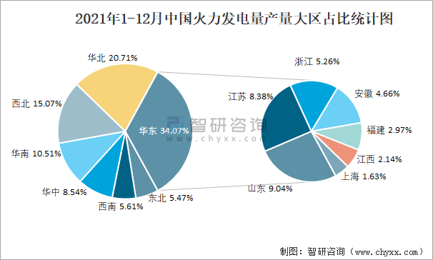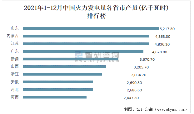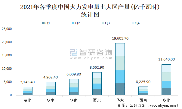 根据国家统计局数据显示:2021年各季度中国火力发电量主要集中在华东、华北、西北地区生产;2021年1-12月中国火力发电量产量大区分布不均衡,其中华东地区产量最高,特别是山东省贡献了最多产量;2021年1-12月中国火力发电量各省市产量呈现梯队式分布,山东、内蒙古、江苏等省产量最多。